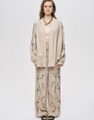 Kahve 34839 Boncuk Pul İşlemeli Tencel Kimono