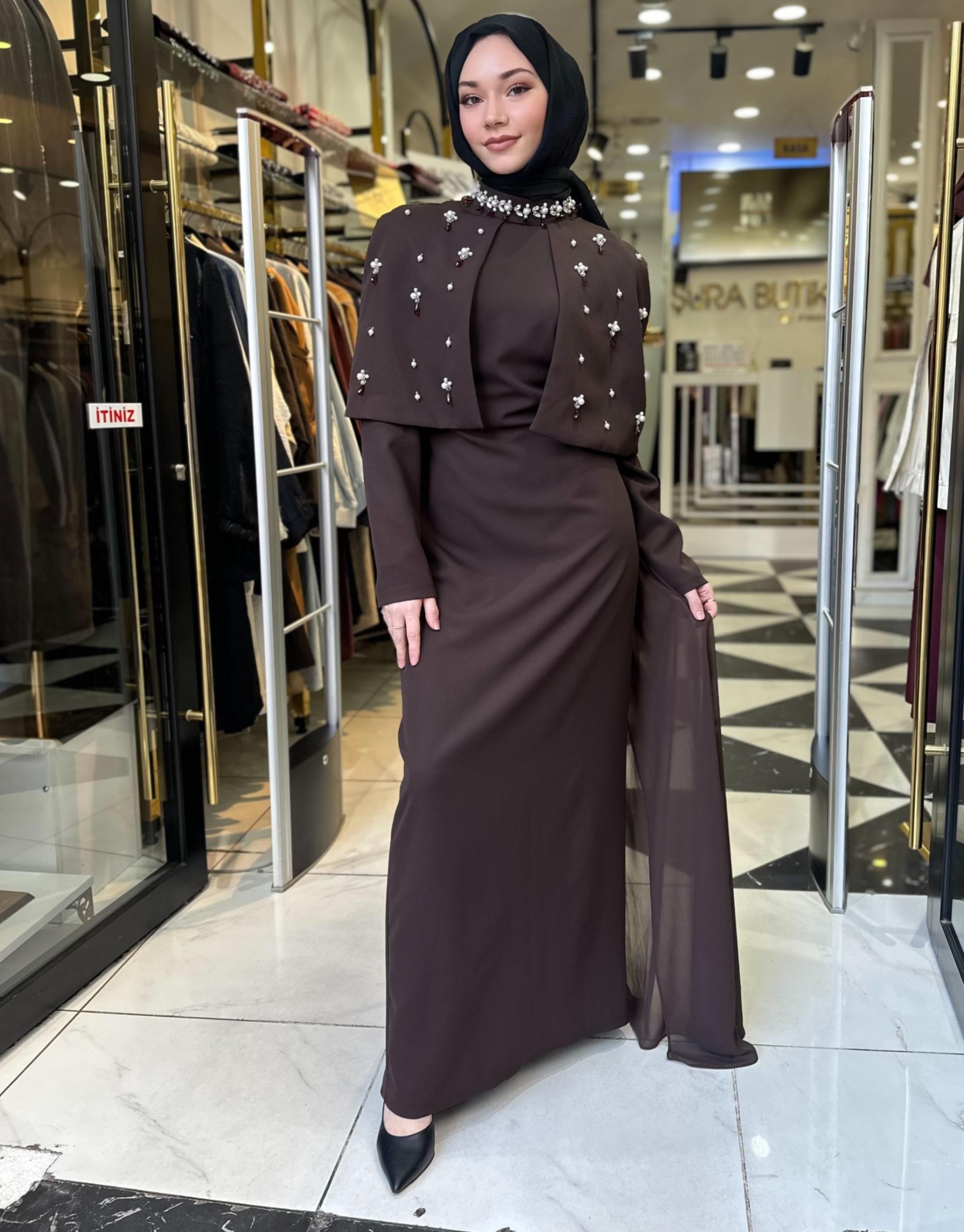 Kahve 3224 White Corner Abiye Elbise